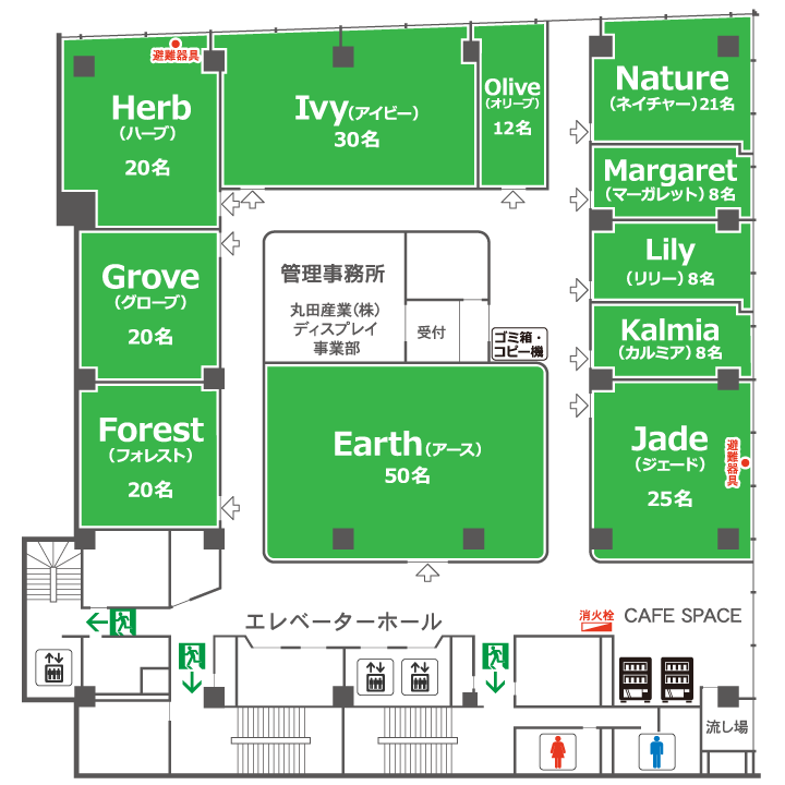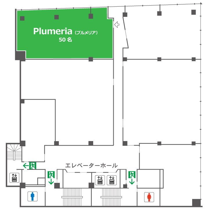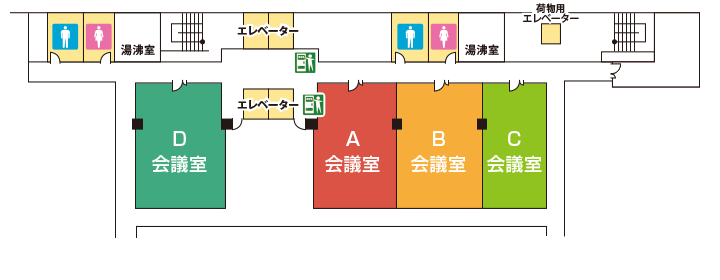 お客様用エレベーターを中心に4つの小会場を配置しています。